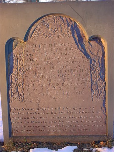 Thomas Cushman – Burial Stone – Inscription: “Here lyeth buried ye body of that precious servant of God, Mr. Thomas Cushman, who after he had served his generation according to the will of God, and particularly the church of Plymouth for many years in the office of a Ruling Elder, fell asleep in Jesus, Decmr. Ye 10. 1691 & ye 84 year of his age.”