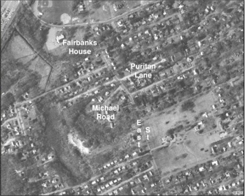 The home site of Michael Metcalf, the immigrant. Michael’s property in Dedham was the long block just south of Puritan Lane and east of East Street and Michael Road.