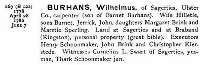 Marretjen’s husband Wilhelmus Burhans was born Jun 1717 in Saugerties, Ulster Cty, NY. His parents were Johannes Burhans (1682 – 1726) and Margriet Legg (1684 – ). After Marretjen died, he married 2 Feb 1753 Age: 35 in Kingston, NY to Hilletjen Schoonmaker. Wihelmus died 7 Jun 1780.