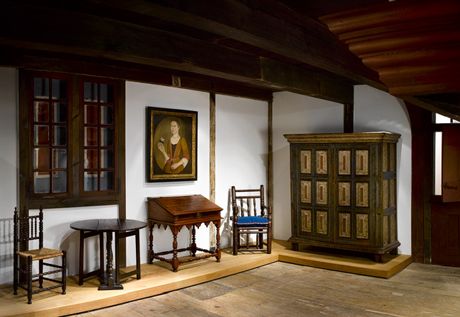 The New York Dutch Room installation includes two singular pieces of furniture that suggest the intermingling ofEnglish and European craft traditions in colonial New York, a city that supported a diverse population of artisans and patrons. The late seventeenth-century turned armchair (41.111) was originally owned by Dutch immigrants living in the New York City area. There is no doubt the desk-on-frame (44.47) was also made locally. It was discovered in Brooklyn and incorporates gumwood, a regional resource. Moreover, an inscription inside the lid records a business transaction involving one of the numerous Schenck families of Kings County, New York. The double-arched moldings that frame the pigeonholes of the interior can be dated stylistically to about 1700. However, no comparable piece is known.