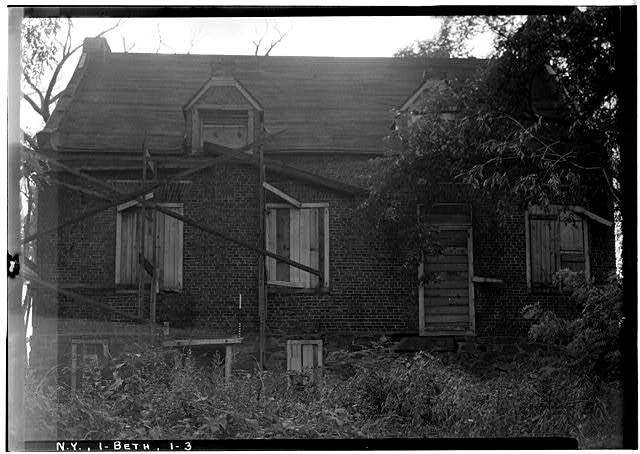 The main portion of this house faces east and stands on ground that slopes from north to south. The slope of the ground occasioned a basement and also high steps up to the front door. Built of brick, the main structure has portholes and a granary door in the north gable. In both gables are iron beam-anchors in the shape of a fleur-de-lis. A wing of the stone house at the rear may have been the original dwelling, antedating the house of 1732. Neighborhood tradition tells of a stone building for slaves’ quarters, which formerly stood near by. Occupation in recent years (1929) by tenants of the laboring class has altered the house in many details. In 1929, the house was owned by the Knickerbocker Ice Company.