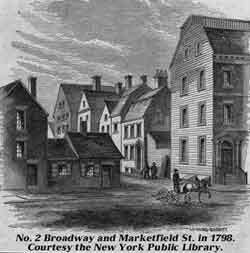 Broadway and Marketfield in 1798. Until 1830 or so, Marketfield Street extended west to the Hudson River, but the section west of Bowling Green was renamed Battery Place.