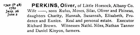 Oliver Perkins Sr. was born 29 APR 1713 in Preston City, New London, CT. His parents were Ebenezer PERKINS and Hannah SAFFORD. He married Hannah GATES on 10 Jan 1733/34 in the 2nd Church in Preston (now Griswold, CT) He was from Voluntown, CT when he was married. Oliver died 26 Jan 1782 in Hoosick, Rensselaer, NY.