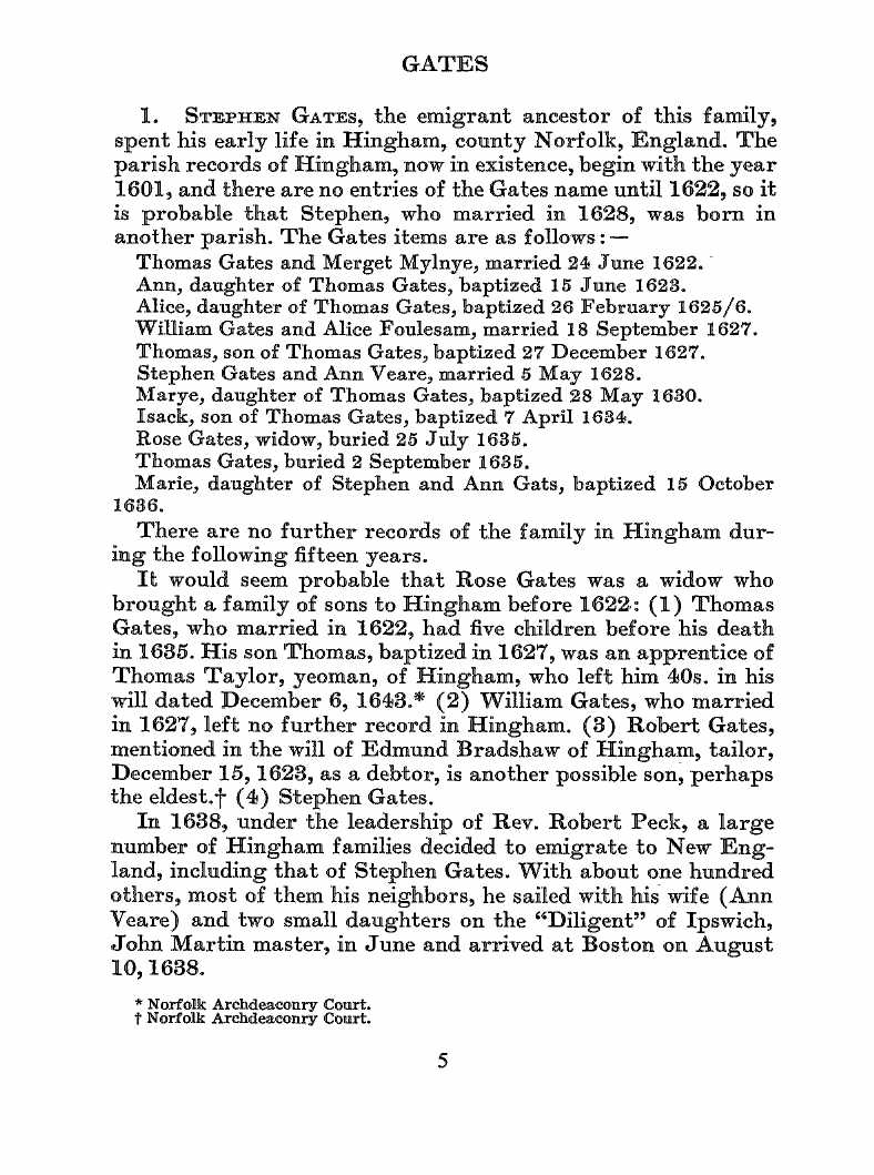 Stephen Gates I was born about 1600 in Hingham, Norfolk, England. His parents were Thomas GATES and Elizabeth ROSE. According to Walter Goodwin Davis, his mother’s name was Rose [__?__] and she was a widow who brought a family of sons to Hingham in 1622. He married Ann VEARE on 5 May 1628 in Hingham, England. Under the leadership of [our ancestor] Rev. Robert PECK, a large number of Hingham families including the Gates decided to immigrate. With about a hundred others, most of them neighbors, he sailed with his wife and two small daughters, the Diligent of Ipswich in 1638. John Martin, Master. She sailed from Ipswich, Suffolk, in June 1638 and arrived August 10, 1638 at Boston, with about one hundred passengers, principally from Hingham, Norfolk, destined for Hingham, Massachusetts. Stephen died in 1662 in Cambridge, Mass.
