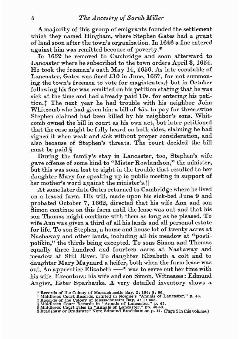 If Stephen was in Cambridge, Mass., in 1652, as stated by some writers, he did not remain there long, since he was one of the early settlers of Lancaster, Mass., where he subscribed to town orders 3 April 1654.