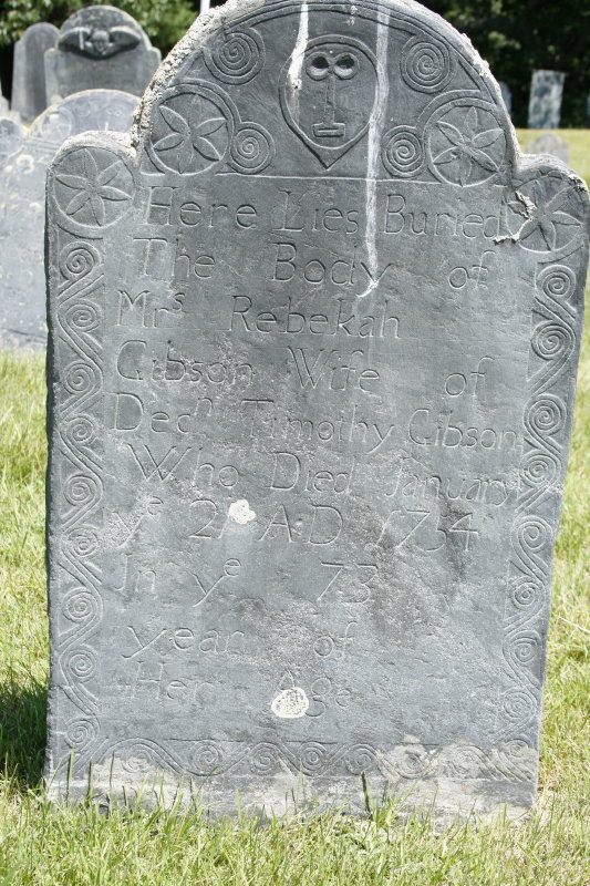 Rebecca Gates Gibson – Lower Village Cemetery, Stow, Middlesex, Mass- “Here lies the body of Mrs. Rebekah Gibson wife of Deac. Timothy Gibson who died Ye 2? AD 1754 in the Ye 73 year of her age”