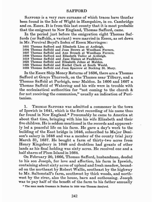 Thomas Safford, was born in England and settled in New England at Ipswich before 1641. He was on the list of proprietors of the town April 6, 1641, and was admitted a freeman 19 Dec 1648. He bought a farm at Ipswich, thirty-two acres, of Henry Kingsbury, 8 Feb 1648. He was a subscriber to Denison’s allowance in 1640 and had a share and a half in Plum Island. He died in February, 1666-7. His will was dated 20 Feb, 1666/67, and proved 26 Mar 1667. He gave his farm to his son Joseph on condition of his care of the father and mother and paying certain amounts to daughters Elizabeth, Mary and Abigail.