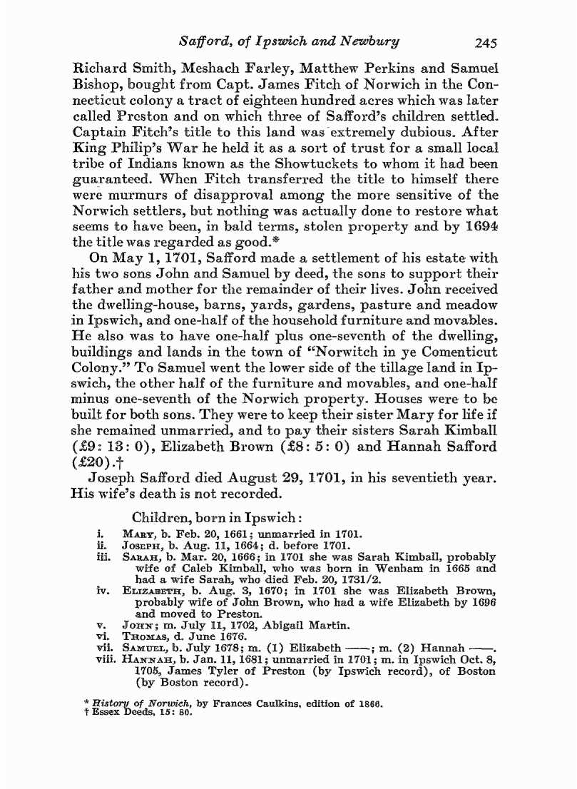 viii. Hannah Safford b. 11 Jan ; unmarried in ; m. 8 Oct 1705 in Ipswich to James Tyler of Preston