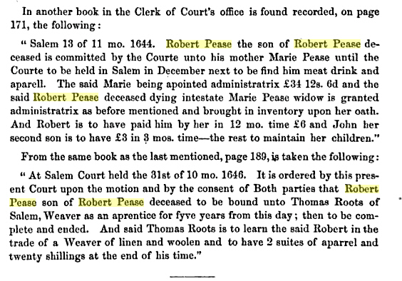 Great Baddow Parish Register: Robert the sonne of Robert Pease and his wife Bap. April 1630 Robert was a minor when his father died in 1644 at the age of 37. By order of the court he was to remain with his mother for a year after which he could apply for permission to learn a trade. At the age of 15 was apprenticed to Thomas Root of Salem for a term of five years. When his term expired in 1650 he remained in Salem, records of 1652 and 1655 show he was an inhabitant of that town.
