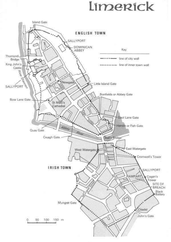 Limerick in 1651 was split into two sections, English town and Irish town, which were separated by the river Abbey. English town, which contained the citadel of King John’s Castle, was encircled by water, the Abbey river on three sides and the Shannon on the other, in what was known as King John’s Island. There was only one bridge onto the island – Thomond bridge – which was fortified with bastioned earthworks. Irish town was more vulnerable, but was also more heavily fortified. Its medieval walls had been buttressed by 20 feet (about 6 metres) of earth, making it difficult to knock a breach in them. In addition, Irish town had a series of bastions along its walls, mounted with cannon which covered its approaches. The biggest of these bastions were at St John’s Gate and Mungret gate. The garrison of the city was 2,000 strong and composed mainly of veterans from the Confederate’s Ulster army, commanded by Hugh Dubh O’Neill, who had distinguished themselves at the siege of Clonmel the previous year.