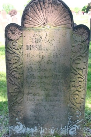 Samuel Pease Headstone – Enfield Street cemetery – The aged Mr SAMUEL PEASE Having faithfully server God & his generation to the universal love & acceptance of all who knew him departed this life in hopes of a better one ye 8 of SEPt 1770 in his 84 year