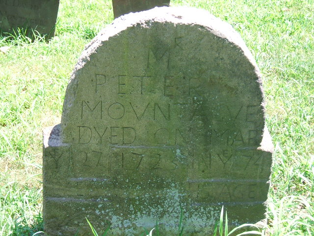 Peter’s third wife Mary Smith was born 16 Aug 1681, Hadley, Hampshire, Mass. Mary Smith’s sister, Hannah Smith, married Peter Mountague’s younger brother, John Mountague. Their parents were Chileab Smith and Hannah Hitchcock .  The gravestones of her parents are of interest.  They read:  “Ens. Chileab Smith died 7 Mar 1731, aged 96 years, and Hannah his wife died 31 Aug 1733, aged 88 years.  It is a worthy memorial that they lived in marriage state for 70 years.”  She first married 15 Dec 1697 to  Preserved Smith.