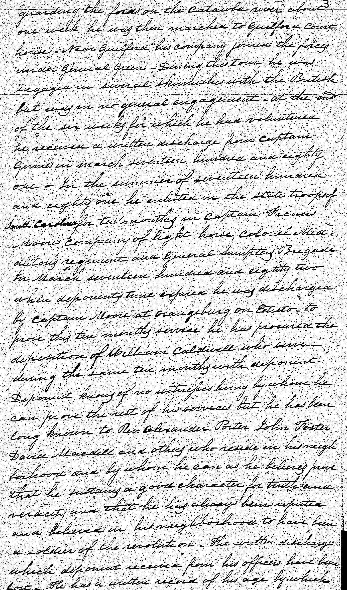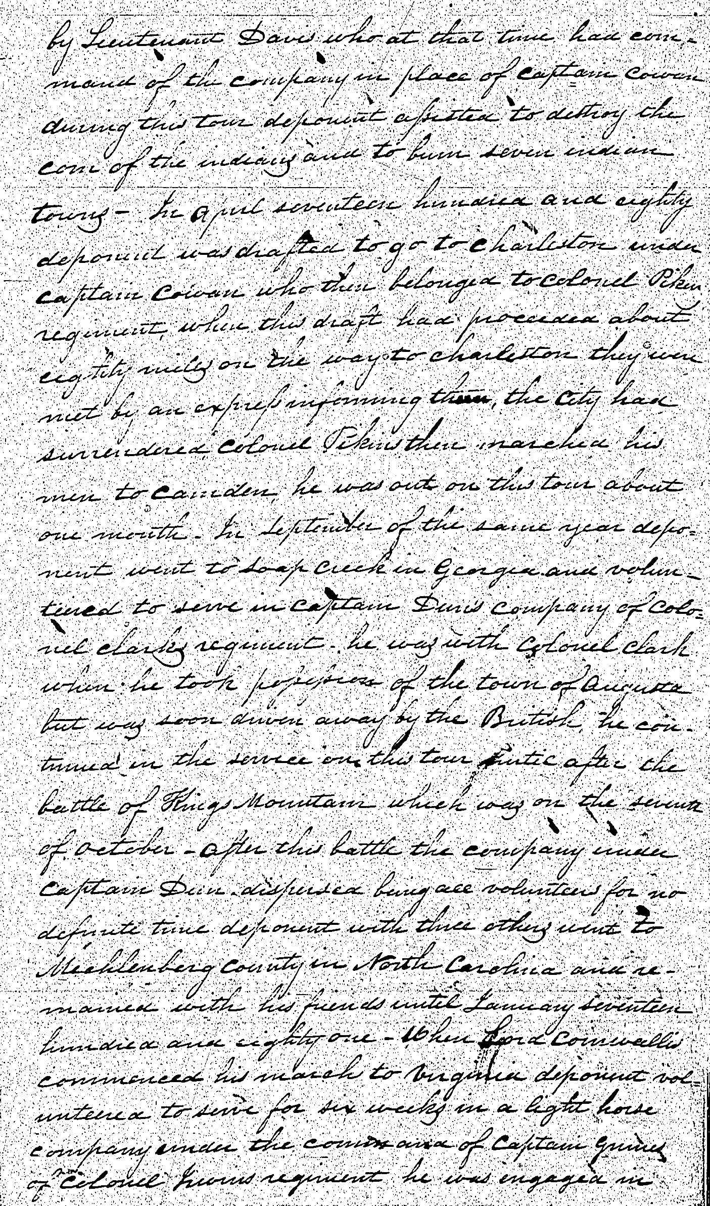 William served in the Revolutionary War in the 58th South Carolina Troops Militia / Ninety-Six District Regiment from fall or early winter of 1775. He began as a private and was promoted to Captain within a year to 18 months of the unit known as John Anderson’s Company. He retained this command until the close of the war. A Private and a Captain under Maj. Andrew Williamson, [later Brigadier General], Col. Andrew Pickens (wiki) [later Brigadier General , Major General and Congressman] . Later, a Captain under Col. Robert Anderson (wiki) (Upper Ninety-Six District Regiment).