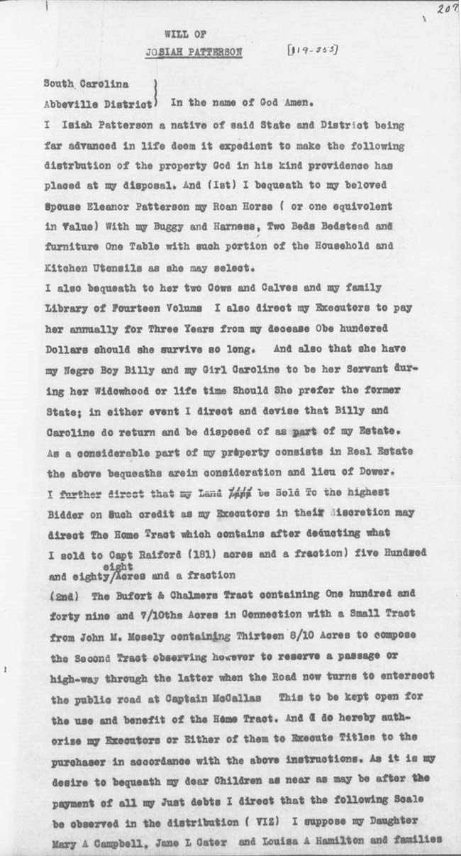 Grandson 2nd Lt Josiah Blair Patterson, b. 19 Jul 1815, Abbeville District, SC; d. 12 May 1864, Battle of Spotsylvania, Va. Carroll R. Pattersonm, the author of the Samuel Patterson reference, also compiled and privately published “THE INCOMPLETE CORRESPONDENCE OF LIEUT. JOSIAH BLAIR PATTERSON, 14TH REGIMENT GEORGIA VOLUNTEER INFANTRY, A.P. HILL’S LIGHT DIVISION” ( completed and privately published 20 May, 1961), a collection of several dozen “letters home” from Lt. Patterson as he served and fought with the Confederate Army ( Army of Northern Virginia) from 1861 until he was killed in action,.