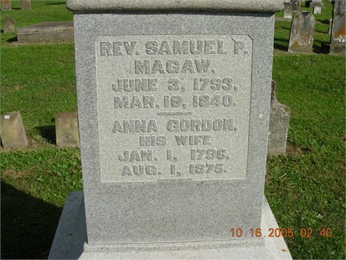 vii. Rev. Samuel Patterson McGaw b. 3 Jun 1793 in Winnsboro, Fairfield, SC; d. 18 Mar 1840 Monroe, Butler, Ohio; m. 18 Aug 1818 in Warren, Ohio to Anna Gordon (b. 1 Jan 1796 in Fayette, Kentucky – d. 1 Aug 1875 in Oxford, Butler, Ohio)