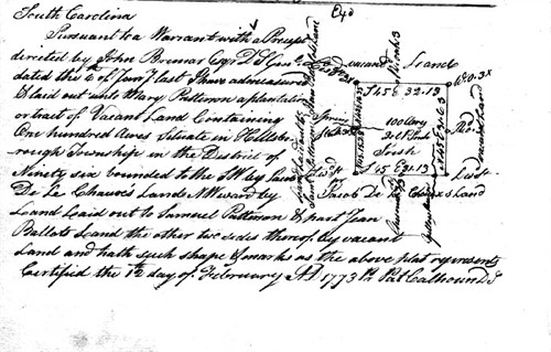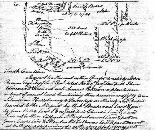 Samuel Patterson’s 350 acres were surveyed on 12 Feb 1773, and was in Hillsborough Township, 96th District, bordered by land of Nick’es Bonchillon, Jean Bellats, Jacob Delchaux, Mary Patterson, James Clark, and Pat Calhoun.