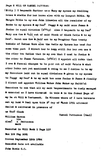 Samuel Patterson’s will was dated March 3, 1791 in Abbeville Dist, Rec September 13, 1794. Exrs: Wm. & John McGaw [both his sons-in-law]. Wit: Thos. Clark, Wm Carson [his wife’s brother], Alexr. Patterson [b. 1751 County Down, Ireland – d. 8 Jun 1839 in Abbeville County, South Carolina; m. Catherine McCaleb (1755 – 1839) I don’t know how Alexander is related ]. Wife: Mary Patterson. Chn: Saml., Josiah, Jas., Margaret, John, Mary, Sarah, Jean Patterson. Will was probated 13 Sep 1794.