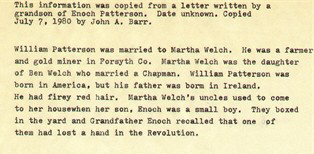 Samuel Patterson Sr. was born about 1725 in Dysart, Newry, County Down, Ireland. His father may have been James PATTERSON. He married Mary CARSON about 1755 in Newry, County Down, Ireland. Samuel, Mary and their first six children were part of a large group of Presbyterians who followed an emigration led by the Reverend William Martin in 1772. The Pattersons sailed on The Freemason departing from Newry on 27 Oct 1772 and arrived in Charleston on 22 Dec 1772. Samuel received a land grant of 350 acres in Abbeville District, South Carolina, 100 acres for himself and 50 acres for each child under 16. His eldest daughter Mary received 100 acres. Samuel died about 1791 in Abbeville District, South Carolina.