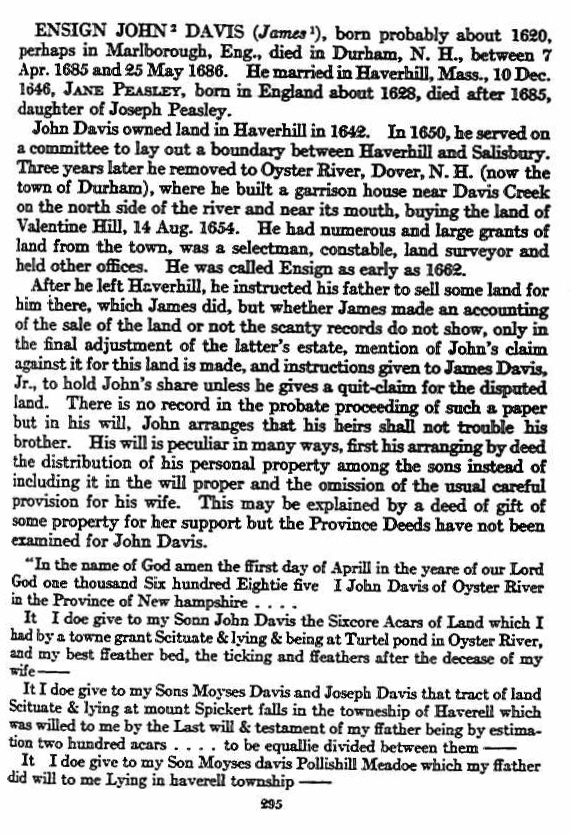 Ensign John James Davis  was born 28 Jan 1621 in Thornbury, Gloucestershire, England. His parents were James DAVIS and Cicely THAYER. He married Jane PEASLEE on 10 Dec 1646 in Haverhill, Mass. Many genealogies say James was killed n 18 Jul 1694, in  Raid on Oyster River Massacre.  John actual died a few years earlier in 1686.  His will was dated 1 Apr 1685 and proved 25 May 1686.