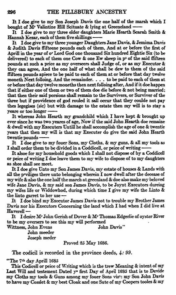 “In the name of God, Amen. The first day of April in ye year of our Lord God. One thousand Six hundred Eighty-five, I, John Davis of Oyster River, in the Province of New Hampshire, being of perfect memory (blessed be the Lord for it) and calling to mind the frailty of my nature and the certainty of death, & how soon it shall please God to call me hence, I know not, I do here make my last Will & Testament, revoking & annulling all & every Will or Wills, Testament or Testaments heretofore made, or done either by word or Writing, and this to be taken for my Last will and Testament.  Imprimis, I commit my soul to God who gave it, and my body to ye earth from whence it was taken, & to be decently buried in some covenient place where my Executors hereafter named shall appoint.  And as for my temporal Estate which it hath pleased God to bestow upon me, I do order and dispose of it in manner as followeth.  It my Will is, That all such Debts as I do in reason & conscience ow to any person or persons, be honestly and justly paid in some convenient time after my decease; Then my debts being paid & my funeral charged defraid, what shall remain I do dispose of to wit: