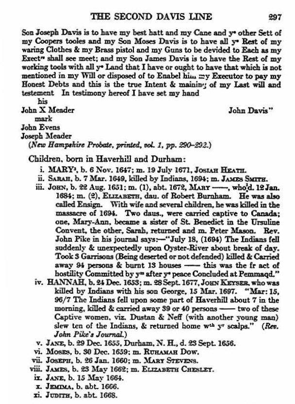xi. Jeremiah Davis b. 1708 in Dover, Norfolk, Mass; d. 1767 Durham, Strafford, New Hampshire; m. 1734 to Sarah Jenkins (b. 1700 in Reading, Middlesex, Mass. – d. 1744 in Durham, Strafford, New Hampshire)