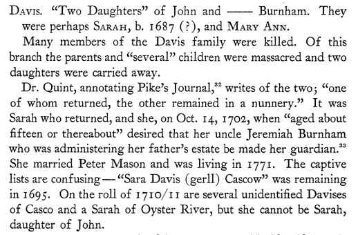 ii David Davis b. ~1695 Oyster River, Strafford, New Hampshire; m. 28 Jun 1717 Oyster River to Elizabeth Thomas