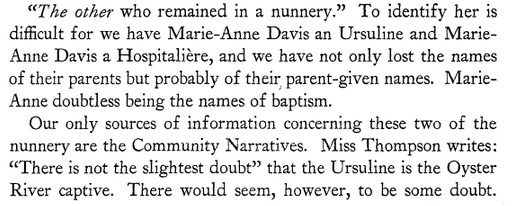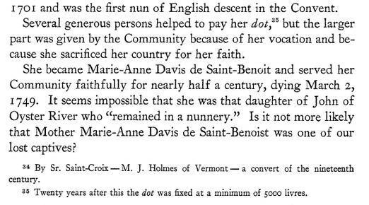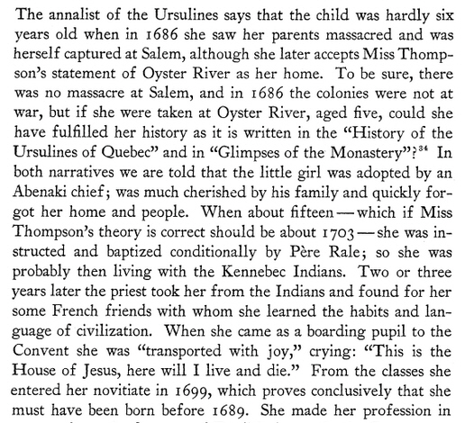 John’s daughter Sarah,  John’s son John Jr., John Jr.’s wife  and two other members of his family were killed by Indians in the Oyster  River Massacre  18 Jul 1694 in Haverhill, Mass.  Two of Sarah’s sons, Two of Sarah’s daughters and two of John Jr.’s daughters were carried as captives to Canada.   Another sister, Judith Davis, wife of Captain Samuel Emerson, was also taken by the Indians and remained in captivity five years.  One of John Jr’s girls, Mary Anne,  became a nun at the Hotel Dieu, Quebec, in 1710, under the name of Sister St. Cecilia. She was taken to Canada by the Rev. Father Vincent Bigot, S.J., who had ransomed her from the Indians at St. Francis. She is mentioned as leading ” a holy life ” for more than fifty years in the religious state. She died in 1761, at the age of seventy-three.