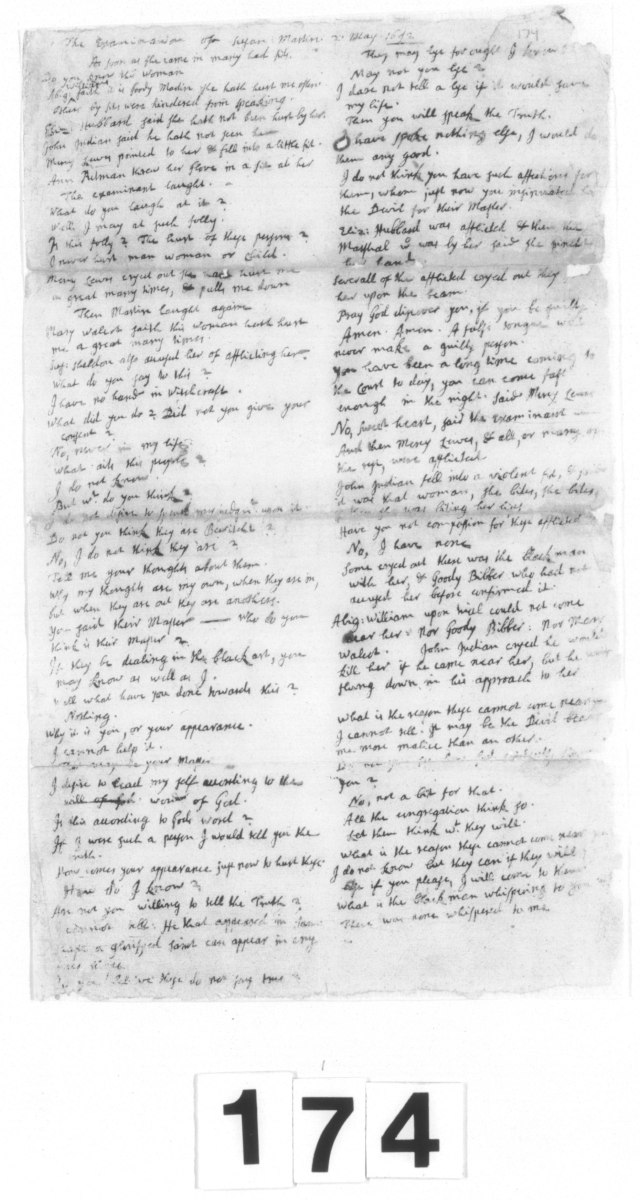 Javis Ring of Salisbury maketh oath as followeth, That about seven or eight years ago he had been several times afflicted in the night time by somebody or something coming up upon him when he was in bed and did sorely afflict by laying upon him and he could neither move nor speak while it was upon him, but sometimes made a kind of noise that folks did hear him and come up to him and as soon as anybody came, it would be gone. This it did for a long time before and since but he did never see anybody clearly, but one time in the night it came upon me as at othr times and I did then see the person of Susanna Martin of Amesbury. This deponent did perfectly see her and she came to this deponent and took him by the hand and bit him by the finger by force and then came and lay upon him awhile as formerly, and after a while went away. The print of the bite is yet to be seen on the little finger of his right hand for it was hard to heal (he further saith). That several times he was alseep when it came, but at that time when bit his finger he was as fairly awake as ever he was and plainly saw her shape and felt her tooth as aforesaid.