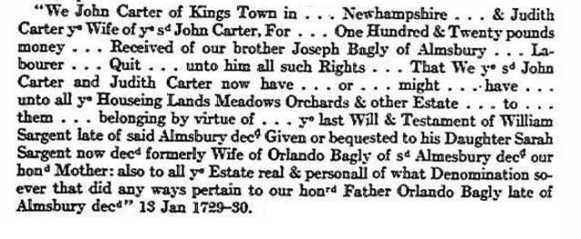 | 5. | Judith Bagley | 13 Nov 1690 Amesbury | John Carter (Thomas Carter’s grandson) 25 Apr 1711 Amesbury |