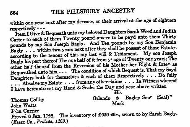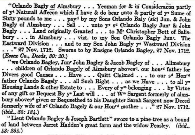Orlando Bagley was born 18 Feb 1658 in Boston, Mass. His parents were Orlando BAGLEY Sr. and Sarah COLBY. He married Sarah SARGENT 22 Dec 1681 in Amesbury, Essex, Mass. After Sarah died, he married Sarah Annis 25 Mar 1704 in Newbury, Essex, Mass. Orlando died 13 Jan 1728 in Amesbury, Essex, Mass.