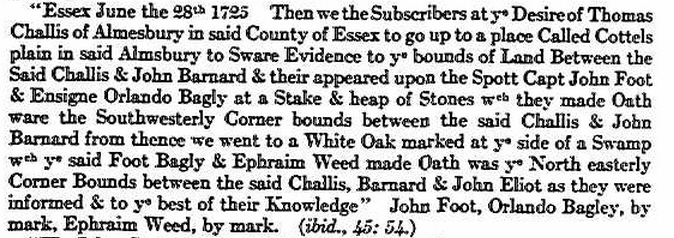 Orlando Bagley Jr. was a man of considerable influence in the district, a constable, who apprehended his friend and neighbor, Susannah Martin (Wikipedia), for a witch. He is at least partly responsible for the execution by hanging of this unfortunate woman. Susannah was the wife of our ancestor George MARTIN.
