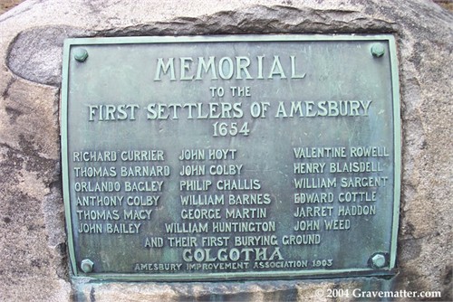 Amesbury Monument – The Golgotha Burying Ground is also found on Rt. 110 (Macy St.), in Amesbury Massachusetts about a half a mile east. It is the first burial ground in Amesbury but there are no markers.