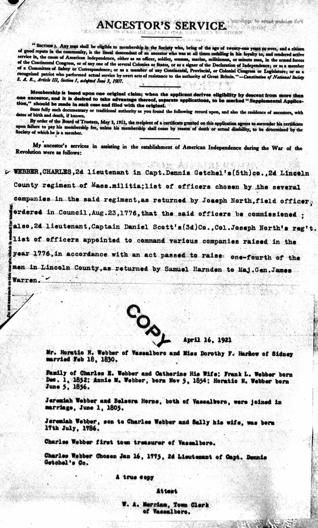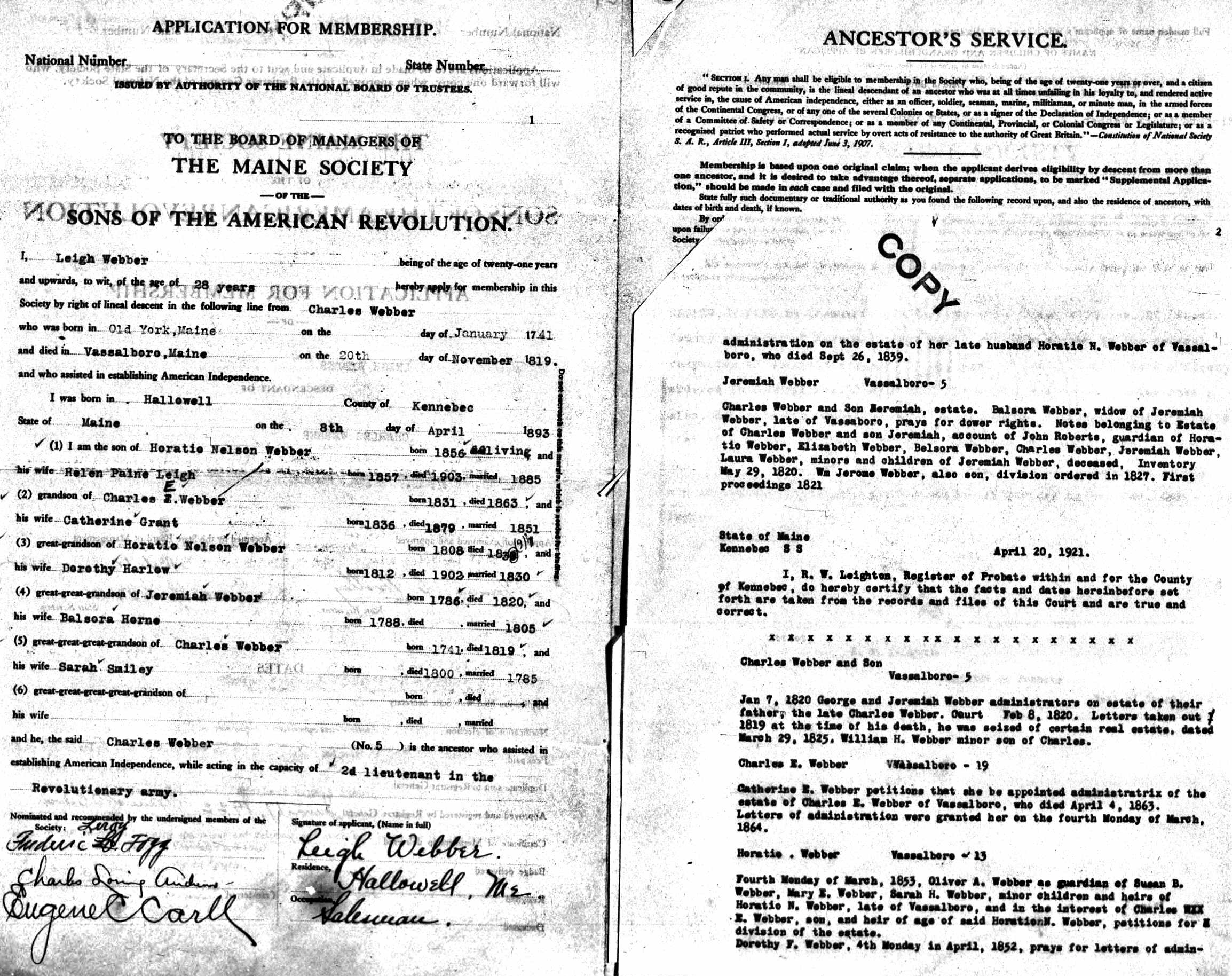 | 1. | Charles E Webber (Heir of age) | 9 Nov 1821 or more likely 9 Nov 1831 Vassalboro, Maine |