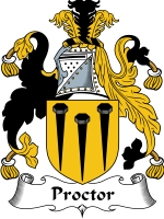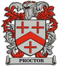 The name “Proctor” is Northern English: it’s an occupational name from the Middle English term prok(e)tour (‘steward’), reduced from the Old French term procurateour, and the Latin procurator (‘agent’, from procurare—‘to manage’). The term was used most commonly of an attorney in a spiritual court, but also of other officials such as collectors of taxes and agents licensed to collect alms on behalf of lepers and enclosed orders of monks. The family Coat of Arms is gold with three black nails; The crest is a red bird. The family motto, “Toujours fidele,” translates as “Always faithful”—which is a rarity for agents.