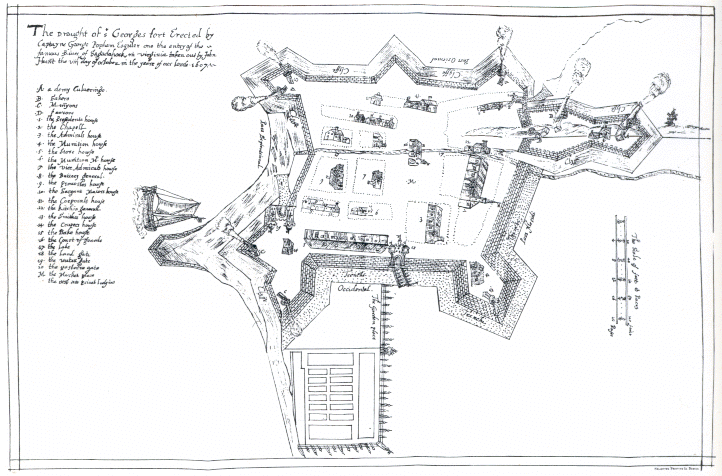 On October 8, 1607, colonist John Hunt drew a map of the colony showing 18 buildings including the admiral’s house, a chapel, a storehouse, a cooperage, and a guardhouse. Hunt was listed in the colony register as “draughtsman”. It is not known if all the buildings were completed at the time. Hunt’s map was discovered in 1888 in the Spanish national archives. A spy had sold it to a Spanish ambassador who had sent it to Spain. It might be a copy of the now-lost original map, and is the only known plan of the original layout of any early English colony.