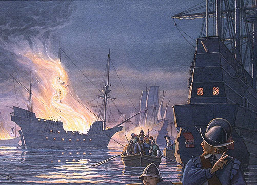 In May 1587 John joined his brother William in Sir Francis Drake’s military expedition against the Spanish naval forces assembling at Cádiz. Much of the Spanish fleet was destroyed. There followed a series of raiding parties against several forts along the Portuguese coast. A Spanish treasure ship, returning from the Indies, was also captured. The damage caused by the English delayed Spanish plans to invade England by more than a year. This incident, known to the Spanish as Drake’s raid on Cádiz 1587, is known to the English by Drake’s phrase “Singeing the beard of the King of Spain”.