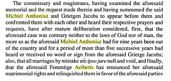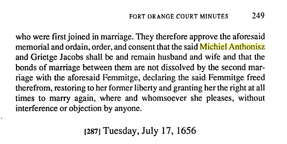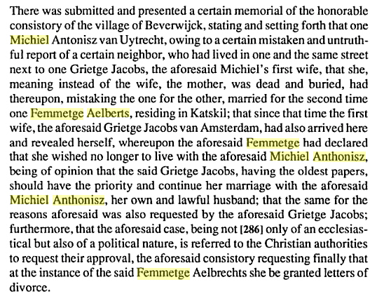 1656 – She was probably the Femmetge Aelberts who married Michiel Anthonisz van Uytrecht in 1656. Through an unfortunate mistake, Michiel had been led to believe that his first wife in the Netherlands had died and subsequently married Femmetje, who was then living in Catskill. The first wife, still alive, then arrived in the New World. Femmitje stepped aside and was granted a divorce 4 July 1656.
