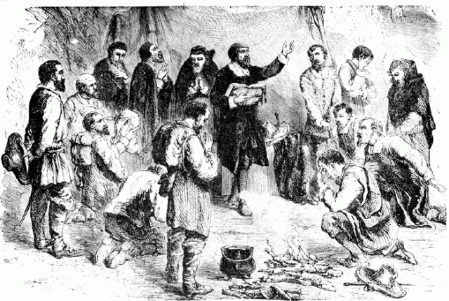 First Sabbath Service of the Pilgrims - 20 Dec 1620 "The next day, the Sabbath, the men returned to an immense rock at the center of Clarks Island and gave God thanks for his mercies in their manifold deliverances."