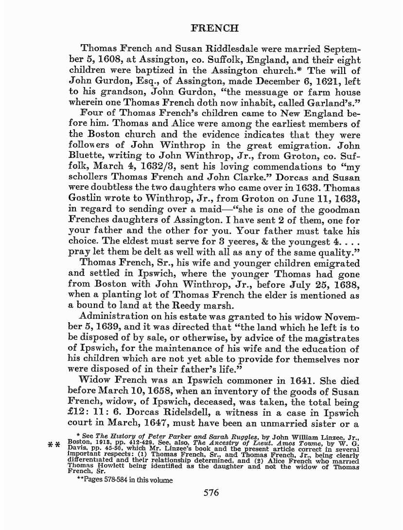 Susan Riddlesdale was baptized 20 Apr 1584 in Boxford, Suffolk, England. Her parents were John RIDDLESDALE and Dorcas [__?__].  A ” widdow French ” was Commoner of Ipswich in 1641.  Dorcas Riddlesdale was a witness in a case in Ipswich Cournt in March 1647.  Perhaps Dorcas was a niece as Susan'[s sister Dorcas was buried on 15 Dec 1610 in Assington,  Suffolk, England.  Susan died in Aug 1658 in Ipswich, Essex, MA [Ipswich Town Clerk Records, film #0777636]