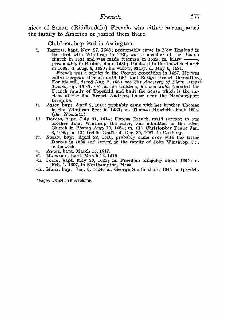 The Rev. Nathaniel Rogers, vicar of Assington, came to New England 17 Nov. 1636, and was pastor at Ipswich until his death in 1665. Four other Assington families came with him, including that of Robinson (N. E. Reg. XLI : 183; XLIV : 400).  It would be natural for Thomas French, the elder, to have come over soon after the departure of his noted pastor.  Thomas died before 5 Nov 1639 in Ipswich, Essex, Mass. when his estate was administered.