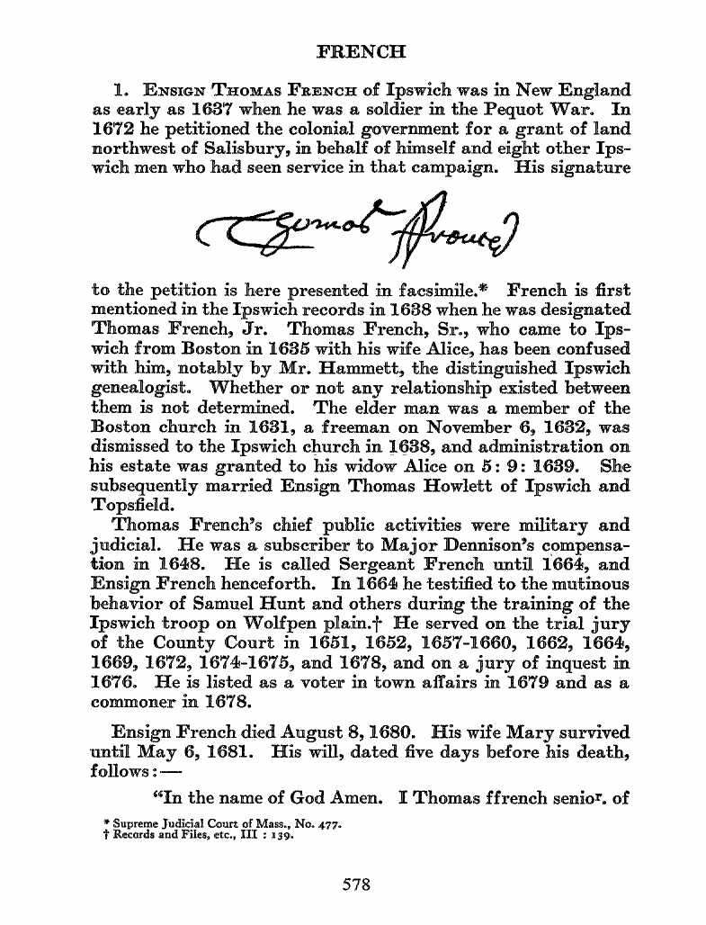 Thomas French fought in the Pequot War in 1637.  Proposed for Lieutenant, 25 Mar 1639 (but apparently not confirmed; in a letter of that date Daniel Dennison writes to John Winthrop “Our company wanting some officers, have according to their liberty, made choice of some, whom they desired me to propound to the Court or Council. They were willing to express their love and liking to Sergeant French and Sergeant Howlett proposing the former for Lieutenant, the other for Ensign”). On 18 May 1664 “Sergt. Thomas French deposed that being ordered by Major Genll. Denison to carry two soldiers who were stubborn off the field to prison, he went to them and persuaded them to submit themselves, promising to mediate for them.”  Appointed Ensign at Ipswich 18 May 1664 In 1672, he petioned the colonial government for a grant of land northeast of Salisbury in behalf of himself and eight other Ipswich men who had been of service in that campaign.”