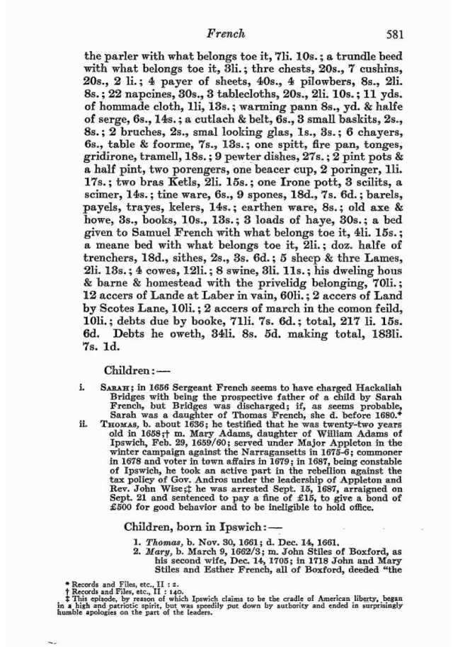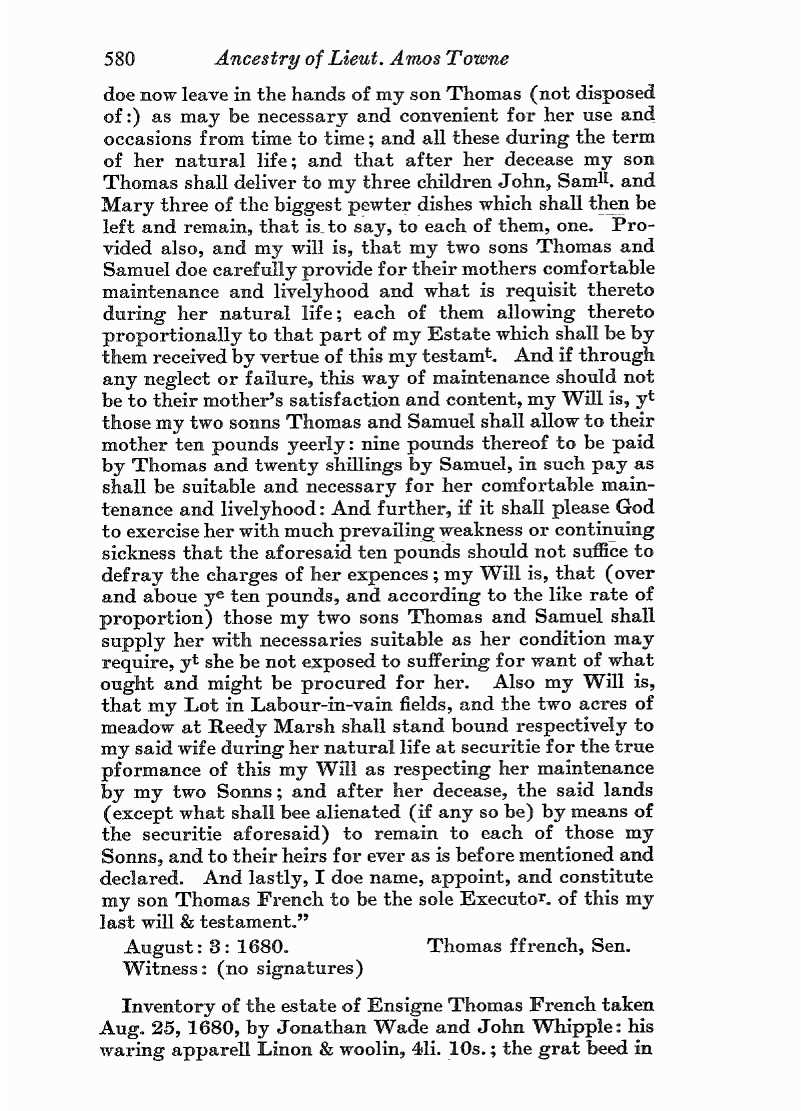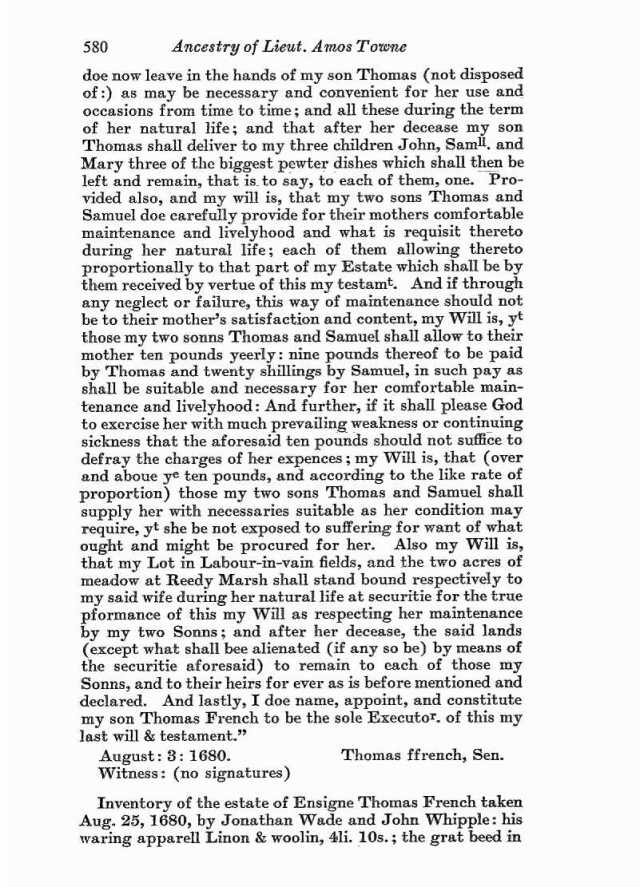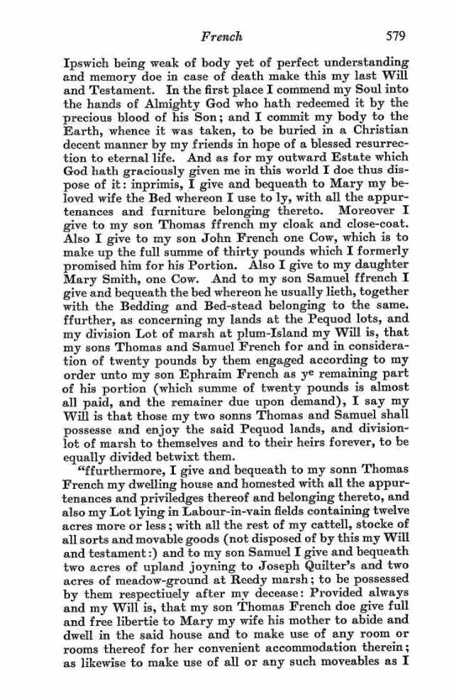 ..Thomas French Senior of Ipswich … being weak of body” bequeathed to “Mary my beloved wife the bed whereon I used to lie, with all the appurtenances and furniture belonging thereto”; to “my son Thomas French” clothing; to “my son John French” one cow “to make up the full sum of £30 which I formerly promised him for his portion”; to “my daughter Mary Smith” one cow; to “my son Samuel French” a bed and bedding; “my sons Thomas and Samuel French” in consideration of £20 paid to “my son Ephraim French” as the remaining part of his portion, “my two sons Thomas and Samuel” shall receive the Pequod lands and division lot of marsh to be equally divided betwixt them; to “my son Thomas French” my dwelling house and homestead, also my lot in Labour-in-vain fields of twelve acres, also the rest of my cattle, stock, and moveable goods; to “my son Samuel” two acres of upland and two acres of meadow at Reedy marsh; “my son Thomas French” to give free liberty to “Mary my wife his mother” to dwell in the said house and to make use of any room or rooms thereof for her convenient accommodation … likewise … any such moveables as I do now leave in the hands of my son Thomas”; after her [Mary’s] decease, “my son Thomas” shall deliver to “my three children John, Samuel and Mary” three of the biggest pewter dishes; “my two sons Thomas and Samuel” to provide for “their mother’s” comfortable maintenance, and if she is not satisfied, they to allow her £9 paid by Thomas and 20s. paid by Samuel annually; and if she suffers sickness and the aforesaid £10 does not suffice, “my two sons Thomas and Samuel” shall supply her with necessaries and my lot in Labour-in-vain fields and two acres of meadow at Reedy Marsh shall stand bound respectively to my said wife during her natural life as security for the true performance of this my will as respecting her maintenance by my two sons; “my son Thomas French” sole executor