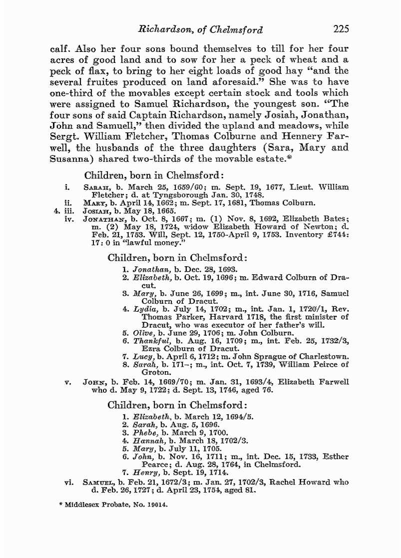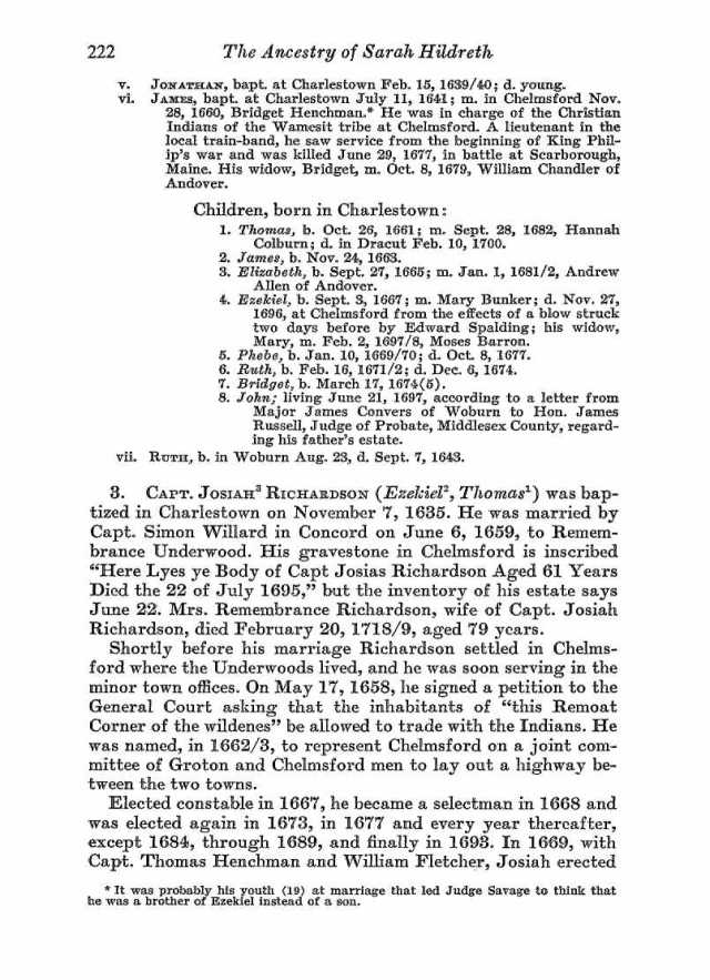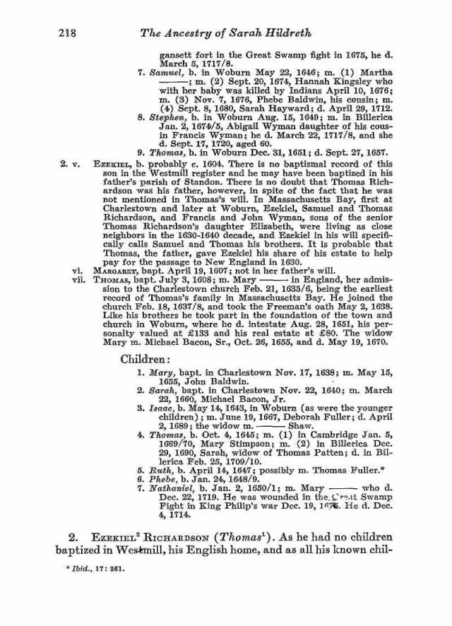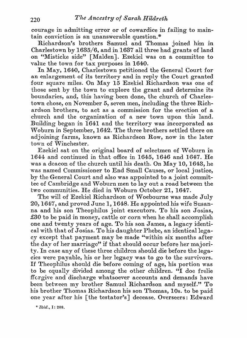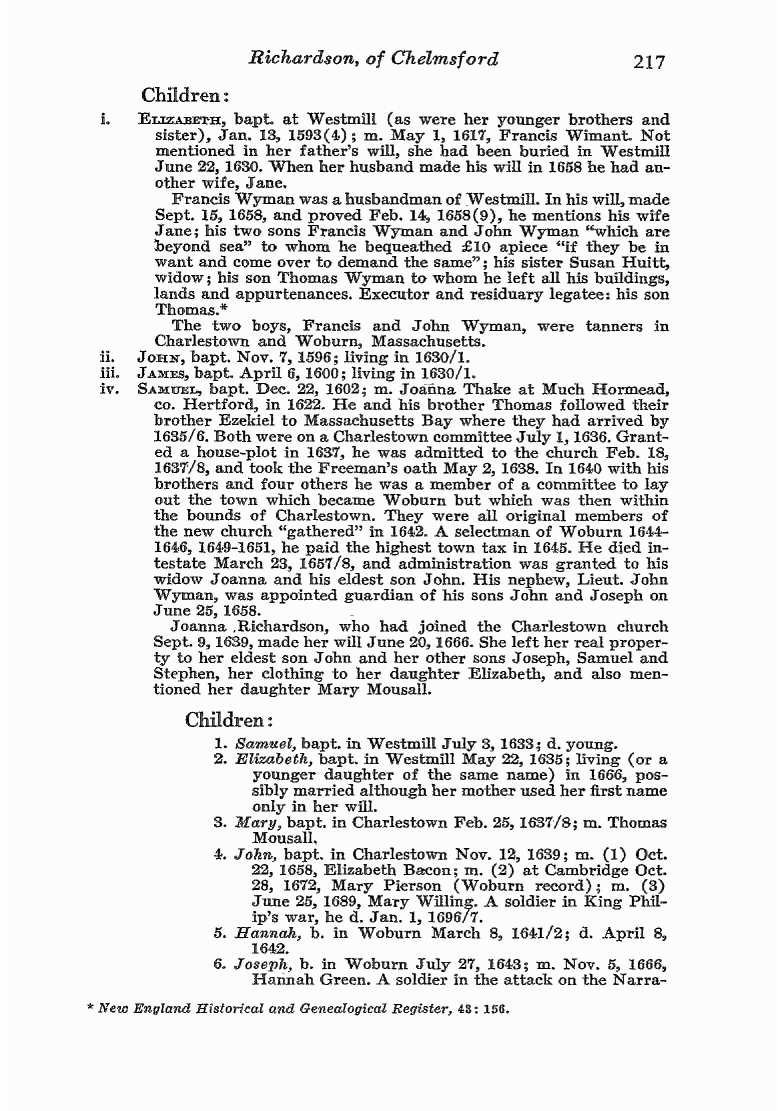 In Massachusetts Bay, first at Charlestown and later at Woburn, Ezekiel, Samuel and Thomas Richardson, and Francis and John Wyman, sons of the senior Thomas Richardson’s daughter Elizabeth, were living as close neighbors in the 1630-1640 decade, and Ezekiel in his will specifically calls Samuel and Thomas his brothers.