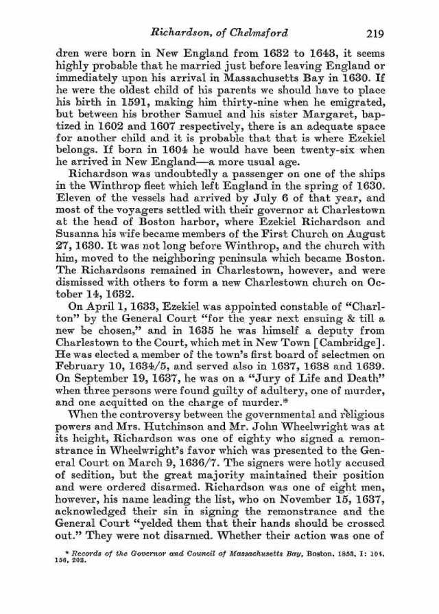 It is probable that Thomas, the father, gave Ezekiel his share of his estate to help pay for his passage to New England in 1630. ” Richardson was undoubtedly a passenger on one of the ships in the Winthrop fleet which left England in the spring of 1630. Eleven of the vessels had arrived by July 6 of that year, and most of the voyagers settled with their govenor at Charlestown at the head of Boston harbor, where Exekiel Richardson and Susanna his wife became members of the First Church on August 27, 1630.