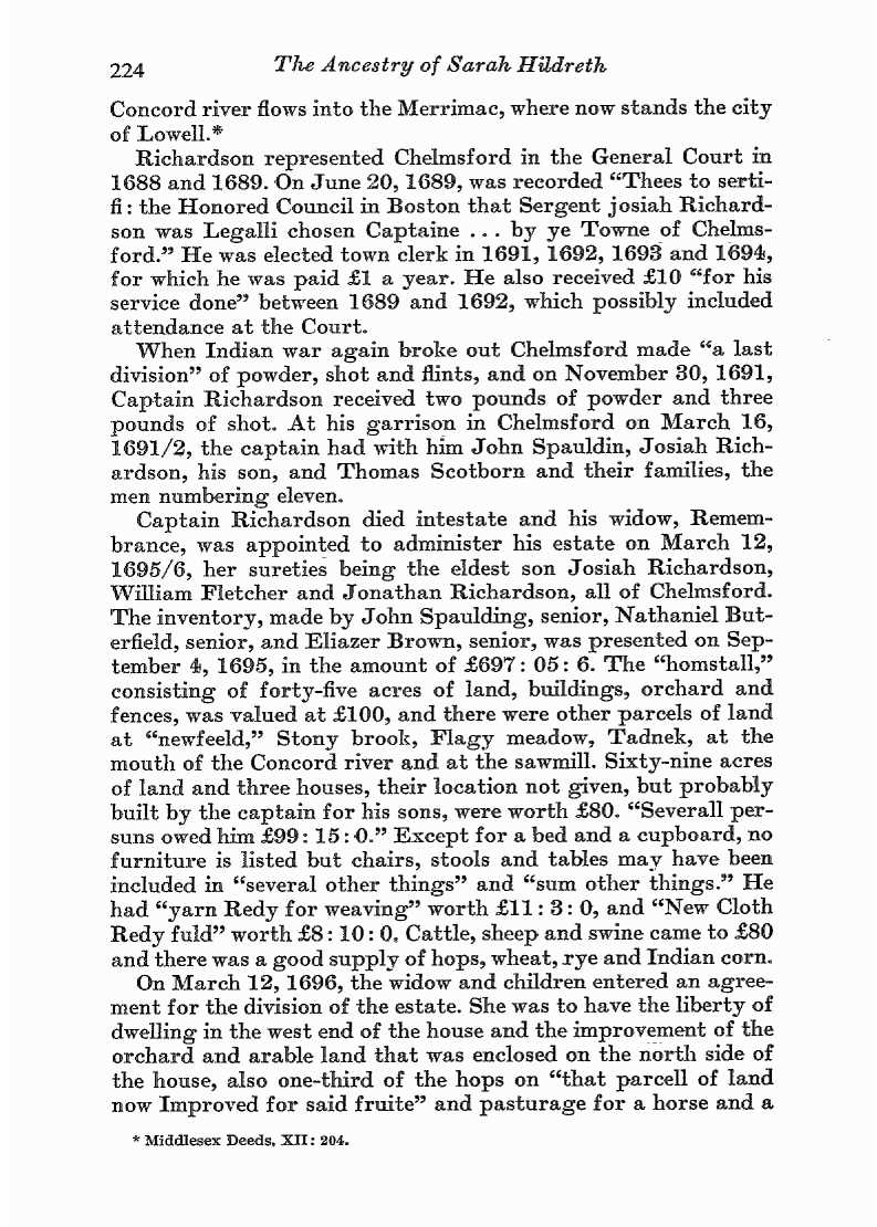 On 6 Mar 1649/50 Edward Converse confirmed to the heirs of Ezekiel Richardson an earlier sale of twelve acres of meadow & upland in Woburn [ MLR 2:71]. On 27 Mar 1651 Samuel Richeson of Woburn “having formerly sold unto Ezekill Richeson my brother (who is since deceased) forty acres of arable & meadow land” in Woburn, confirms the same to “my sister Susanna Brookes (who was the wife of my deceased brother Ezekill Richeson” [MLR 2:72]. On 23 Mar 1654/55 “Susanna Richeson now Brookes formerly the wife of Ezek: Richeson” confirmed a sale made eight years earlier by “Ezekill Richardson & Sussanna Richardson my wife” to Thomas Moulton and John Greenland of thirty-five acres of land in Woburn [MLR 2:36]. On 13 Dec 1659 “Henry Brookes & Susanna Brookes of Woburn,” in accordance with an award of the court, deeded to Theophilus Richardson the right and title they had in “the moiety or half part of the housing & land of Ezekiell Richardson of Woburn aforesaid, by executorship or otherwise” [MLR 2:154].