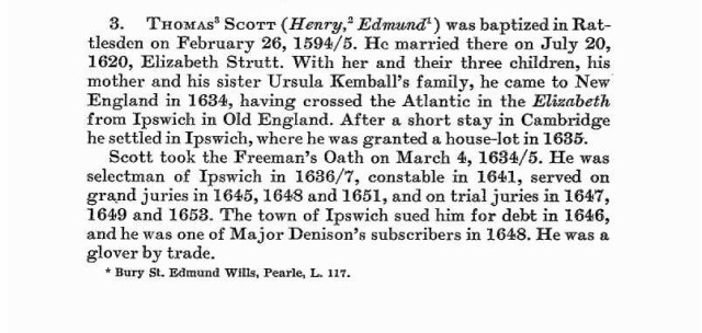 (On 30 April 1634, “Thomas Skott,” aged 40, “Elizabeth his wife,” aged 40, “Martha Scott,” aged 60, “Elizabeth Scott,” aged 9, “Abigail Scott,” aged 7, and “Thomas Scott,” aged 6, were enrolled at Ipswich as passengers for New England on the Elizabeth).