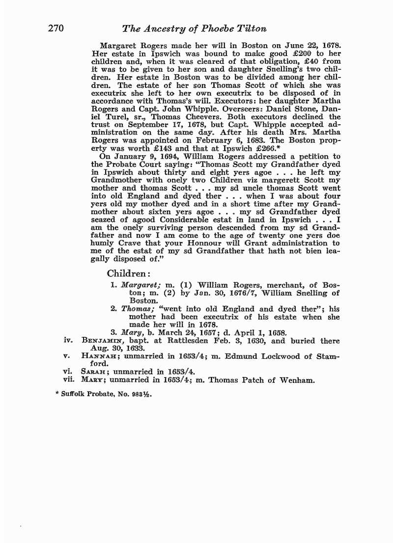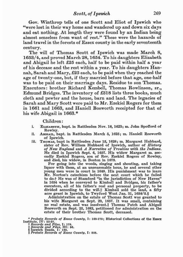 The will of Thomas Scott of Ipswich was made 8 Mar 1653/54, and proved 28 Mar 1654. To his daughters Elizabeth and Abigail he left £25 each, half to be paid within half a year of his decease and the rest within a year. To his daughters Hannah, Sarah and Mary, £25 each, to be paid when they reached the age of twenty-one, but, if they married before that age, one-half was to be paid on their marriage days. Residue to son Thomas. Executors: brother[in-law] Richard KEMBELL, Thomas Rowlinson, sr., Edmund Bridges. The inventory of £318 lists three books, much cloth and pewter and the house, barn and land. The legacies of Sarah and Mary Scott were paid to Mr. Ezekiel Rogers for them in 1661 and 1663, and Haniell Bosworth receipted for that of his wife Abigail in 1663[4] …