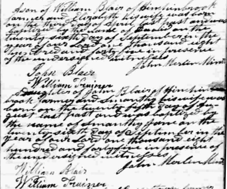 William Blair of Hinchinbrooke baptized his son Daniel and the same day his brother John Blair also of Hinchinbrooke baptized his daughter Samantha Jane – 26 Sep 1845 in the Hemmingford Presbyterian Church. His cousin [and our ancestor