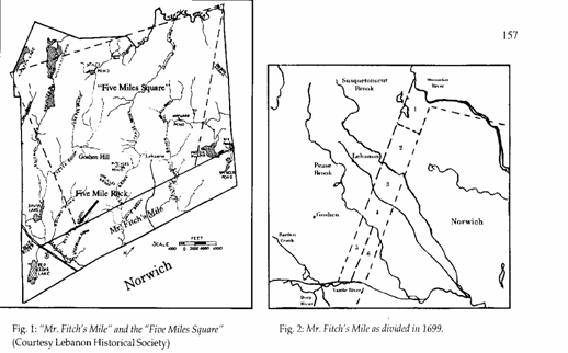 Lebanon, Connecticut, a mere dot on a road map of that state, is an attractive New England town noted for its mile-long Common. The town lies just to the northwest of Norwich and has its origins in the expansion of Norwich residents to land beyond the “nine miles square” they had bought from the Mohegan sachem Uncas. The first grants in the area were given in 1663 to Maj. John Mason (ca. 1600-1672), deputy governor of the Connecticut colony, and in 1668 to Rev. James Fitch (1622-1702), minister of Norwich. These two men were doubly connected by marriage. Rev. Fitch’s second wife was Mason’s daughter Priscilla, and John Mason, Jr. married Abigail Fitch, the minister’s daughter by his first wile, Abigail Whitfield (for some notable descendants of Rev. Henry Whitfield, founder of Guilford, Connecticut, and his wife Dorothy Sheafe, parents of Abigail, see NEXUS10[1993]:71, 74). Maj. Mason and Rev. Fitch were also among the founders of Norwich. The grants were in the southwestern part of what is now Lebanon, an area the Indians called Pomakuck, and lay between Deep River and Goshen Hill. Fig. 1 is a reconstructed map of the area, based on maps in G. McL. Milne, Lebanon (1986), p. 6.