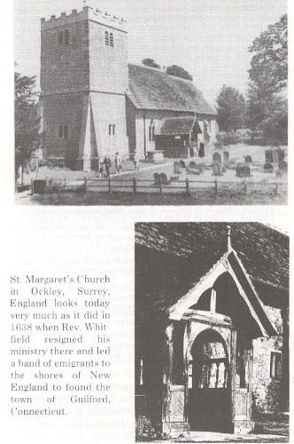 Rev. Henry Whitfield was born 1597 in Mortlake, Surrey, England, now a district of London. His parents were Thomas Whitfield (1545 – 1629) and Mildred Fortune Manning (1560 – 1627).  He married Dorothy Sheaffe 1618 of Ockley, Surrey, England. In 1639, he resigned as Rector of St Margaret’s Church in Ockley and led a  group of 25 families to America. They sailed on the vessel St. John, which left London in June, 1639, and arrived about September 10, 1639 in Guilford CT. Henry returned to England, died there 17 Dec. 1657 and is buried in Winchester Cathedral.